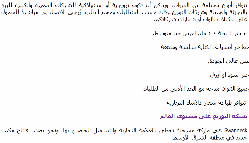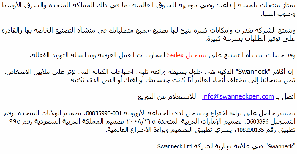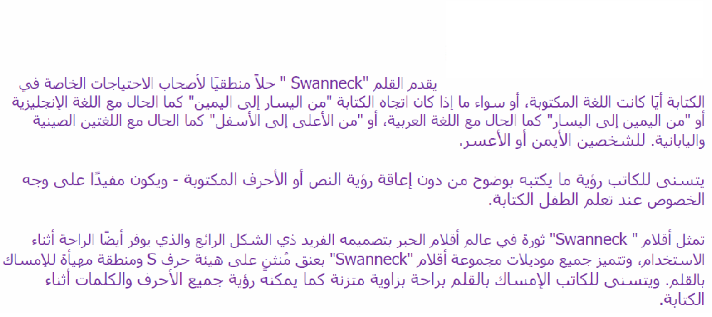 العربية This button links to the Swanneck Twitter account The Swan neck logo which is the logo for the swanneck pen range The R mark The Swanneck pen in new colors as follow; silver, green, blue, red and purple Suitable for left and right-handers of all ages around the world, easy to use & avoids wrist pain