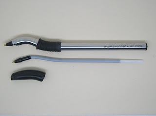 The aluminum model came in a very lovely black presentation box, complete with white satin lining inside. The M.A.D. Associates, Ltd. emblem and web address was stamped on the upper lid. The two plastic versions I received came adhered to a promotional ad which bills Swan Neck as "the logical writing solution." Swan Neck employs a patented "S" bend tip and rubberized ergonomic grip. This gives the pen an angle and holding advantage, allowing the writer to see his / her writing in real time. Swan Neck inventor Anthony Hemmings developed this innovation as a result of his left hand daughter Amy's hand-writing challenges. After years of hard work and investment, Anthony and friend Mike, along with Dillion and recent M.A.D. Associates addition Heather, have brought to fruition Swan Neck Pen's worldwide launch. So, let's take a look at this innovative, left hand friendly writing tool.